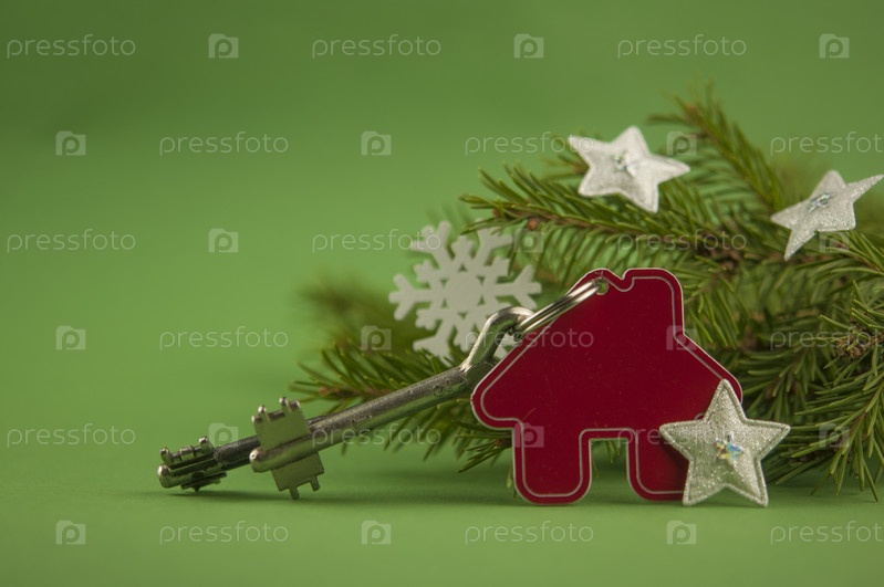 Красивый новогодний фон: декоративный дом и ключ к замку. Концепция финансов и жилищных кредитов. Вид сверху