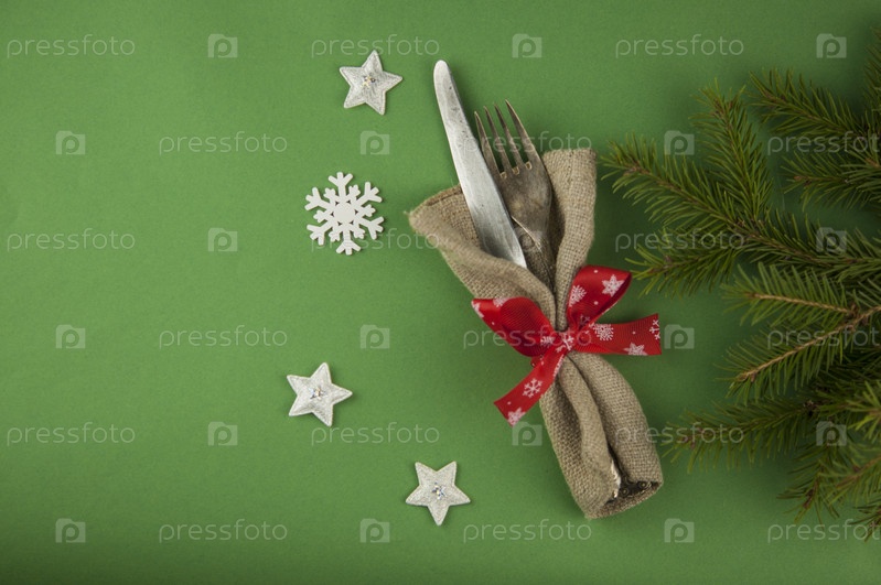 Красочная деревенская праздничная обстановка с ножом и вилкой, завязанными в яркой праздничной рождественской салфетке со шнурком, лежащим на деревянном столе с копирайтом