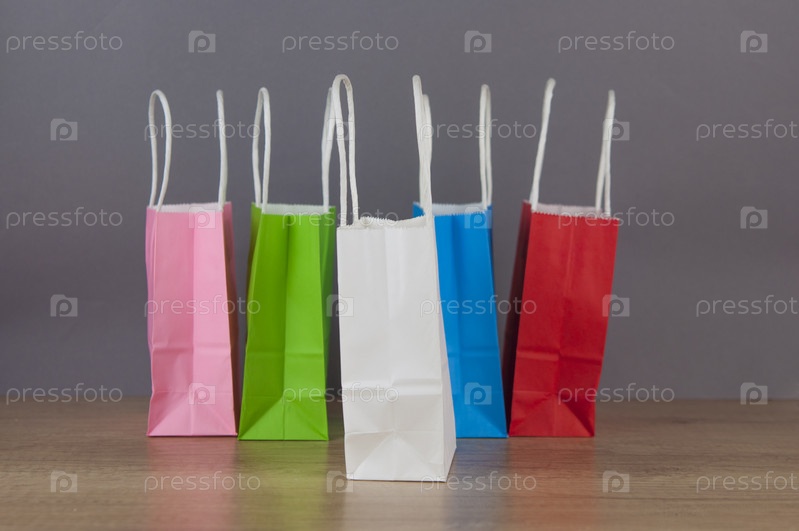 Красочные бумажные сумки на полу на синем фоне стены. Продажа, потребительство, реклама и розничная концепция