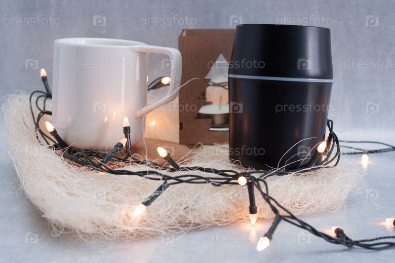 Упакованный новогодний подарок на фоне включенной гирлянды крупным планом