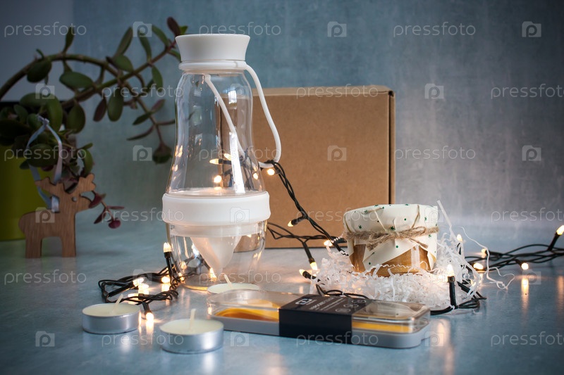 Упакованный новогодний подарок на фоне включенной гирлянды крупным планом