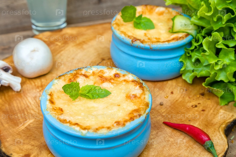 Горшки с жульеном из грибов на деревянной доске