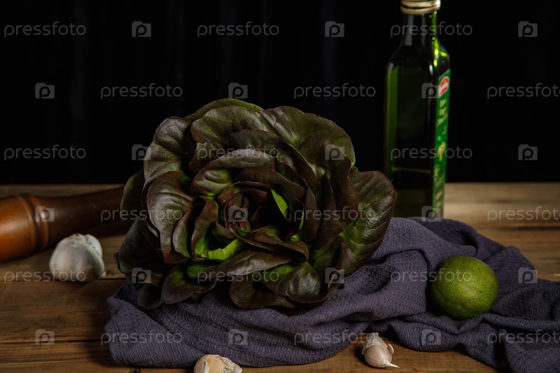 Куча свежих листьев салата на темном фоне. Крупный план
