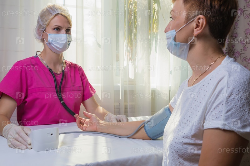 Девушка-врач измеряет артериальное давление взрослой женщины