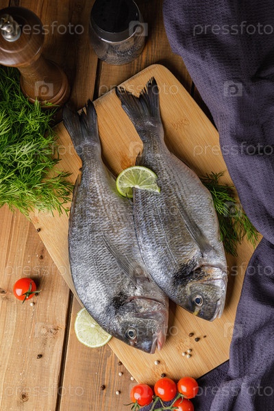 Сырая очищенная рыба дорадо с ингредиентами для приготовления пищи. Свежая рыба на деревянном фоне