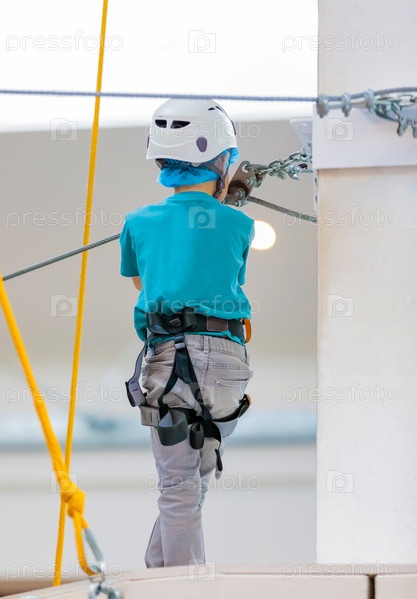 Мальчик поднимается по подвесному мосту в развлекательном комплексе