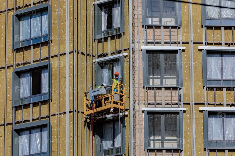 Строители-мужчины работают над фасадом здания в подвесной люльке. Строительные работы