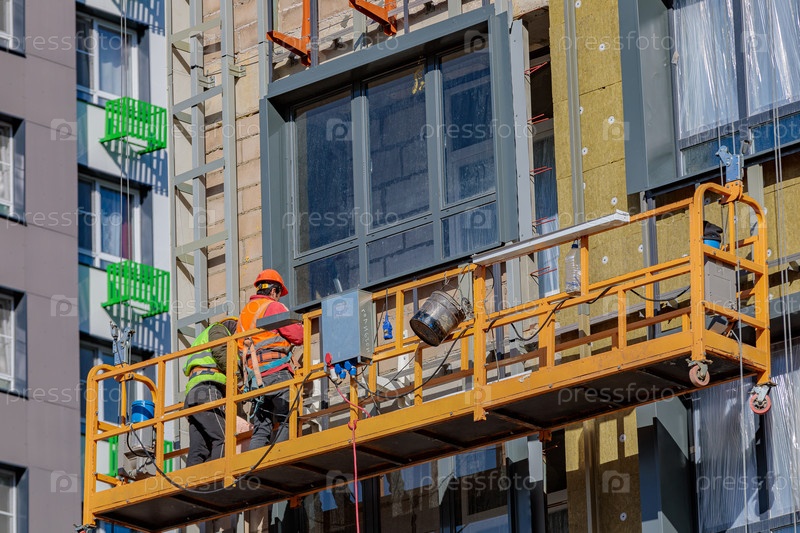 Строители-мужчины работают над фасадом здания в подвесной люльке. Строительные работы