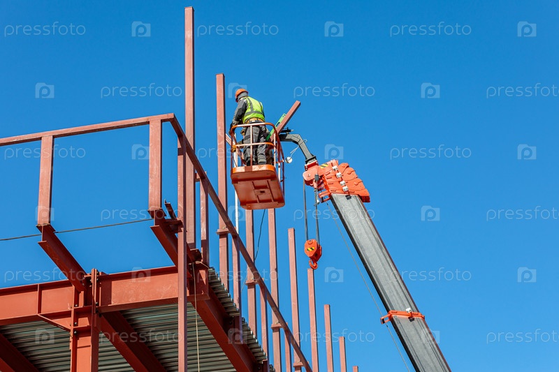 Строители-мужчины работают на высоте в подъемной люльке, создавая железный каркас здания