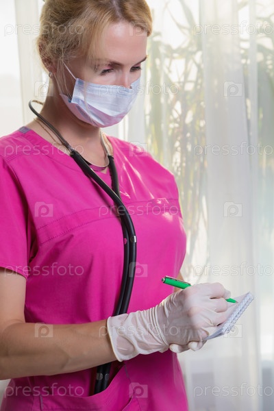Девушка-врач в маске и перчатках записывает показания температуры и давления пациента в блокноте