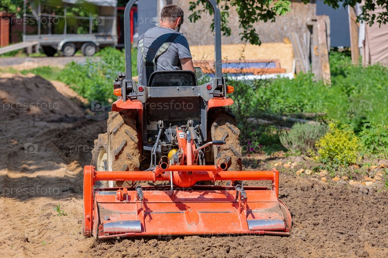 Мужчина на мини-экскаваторе разравнивает участок земли, рыхлит почву