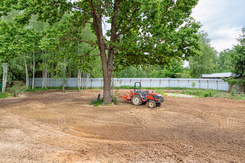 Минитрактор на вспаханной и обработанной земле
