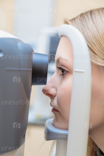 Молодая девушка на приеме у офтальмолога проверяет зрение на специальном аппарате. Крупный план