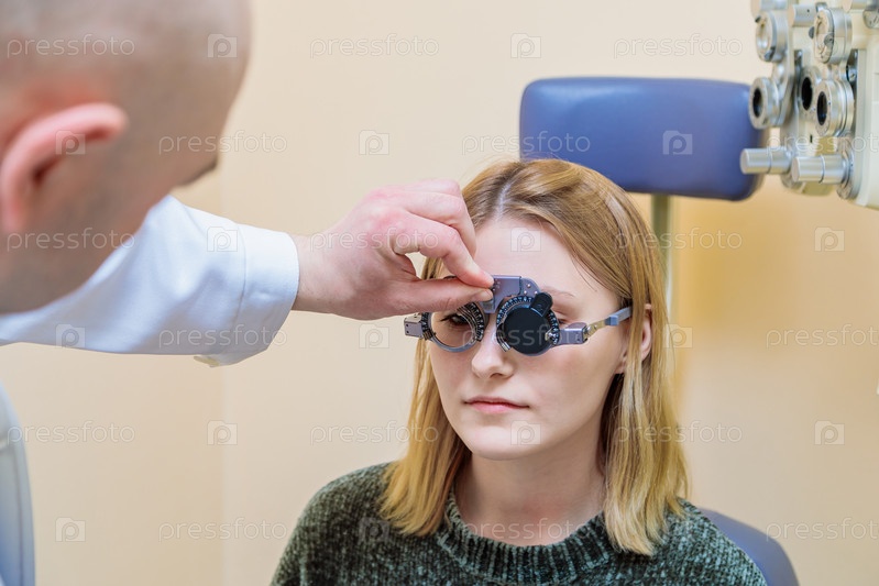 Окулист-мужчина проверяет зрение молодой девушки с помощью пробной рамы