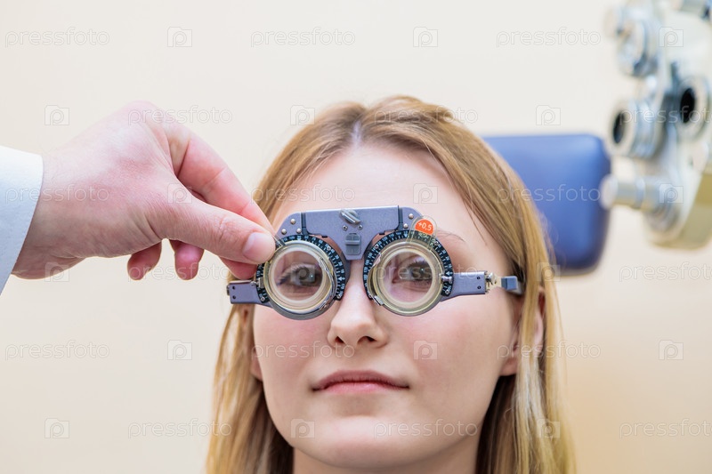 Окулист-мужчина проверяет зрение молодой девушки с помощью пробной рамы