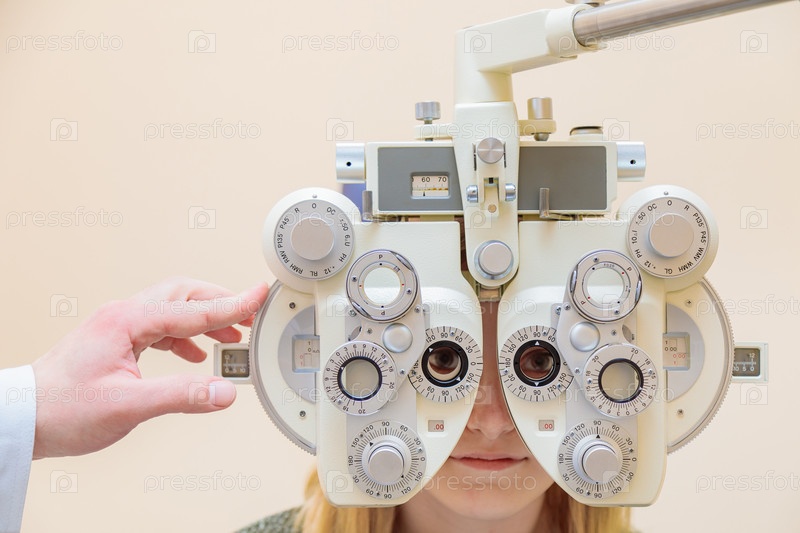 Мужчина-офтальмолог проверяет зрение девушки с помощью фороптера. Лечение зрения