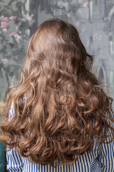 Вид сзади на длинные вьющиеся волосы девушки. Волосы каштановые. Прическа. Крупный план