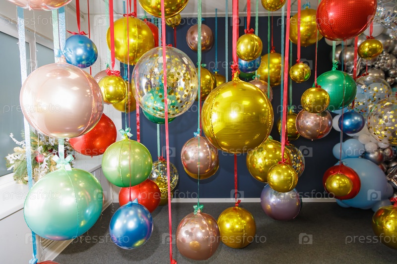 Елочные шары подвешены на ленточках. Празднование нового года, рождества