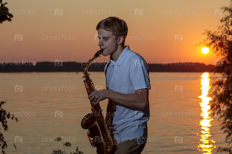 Молодой парень играет на саксофоне вечером на закате