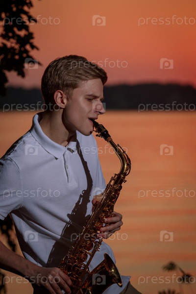 Молодой парень играет на саксофоне вечером на закате