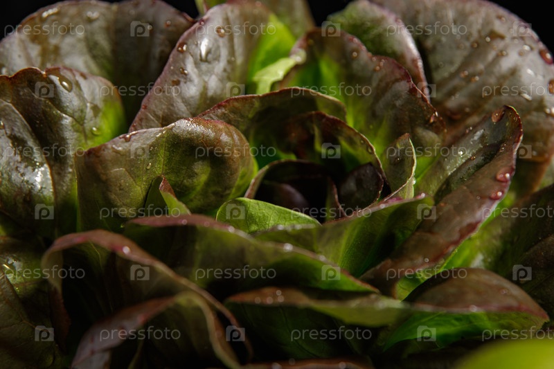 Куча свежих листьев салата на темном фоне. Крупный план