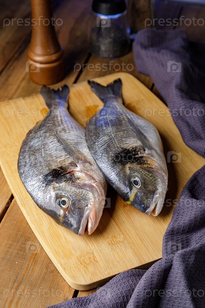 Сырая очищенная рыба дорадо с солонками для приготовления пищи. Свежая рыба на деревянном фоне