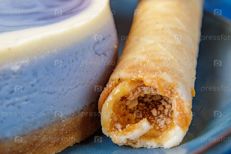 Чизкейк с черникой и кондитерские трубочки со сгущенным молоком на синей тарелке. Крупный план