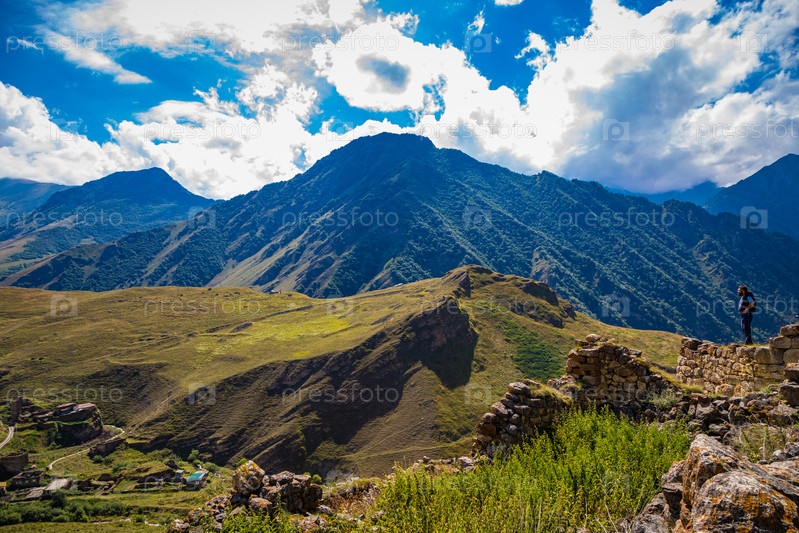Мужчина любуется пейзажем высоко в горах, село Галиат, Северная Осетия
