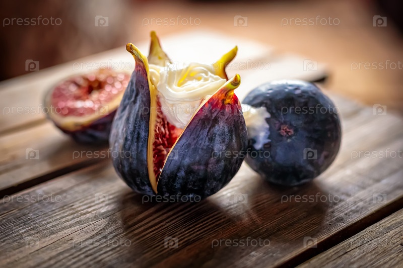 Свежий нарезанный фиолетовый инжир со взбитыми сливками на деревянном фоне из старых досок