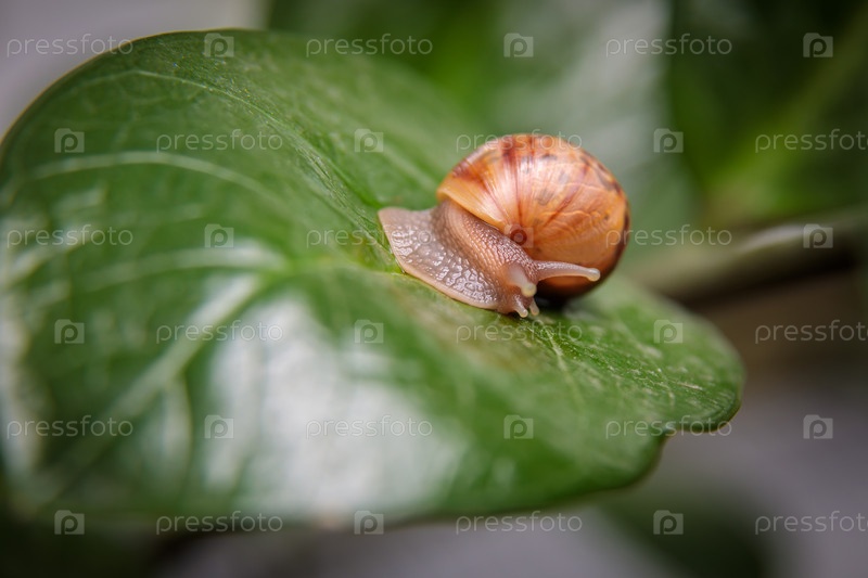 Маленькая улитка сидит на большом листе цветка. Крупный план