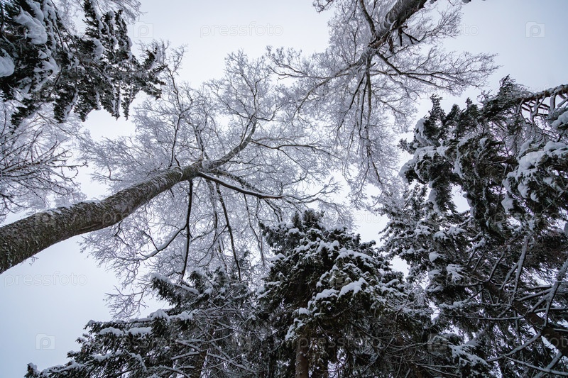 Большие ели в заснеженном лесу. Белый пушистый снег на ветвях деревьев