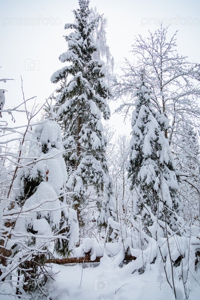 Большие ели в заснеженном лесу. Белый пушистый снег на ветвях деревьев