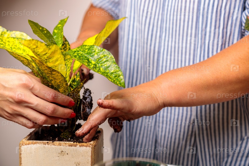 Женщина насыпает землю в новый керамический горшок с пересаженным цветком