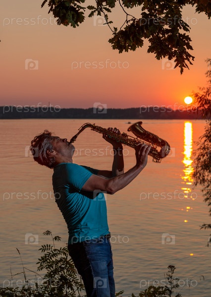 Взрослый мужчина играет на саксофоне на закате у реки вечером