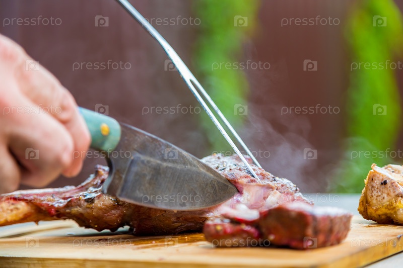 Мужчина режет приготовленное жареное мясо на разделочной доске. На ужин мясо, запеченное в духовке