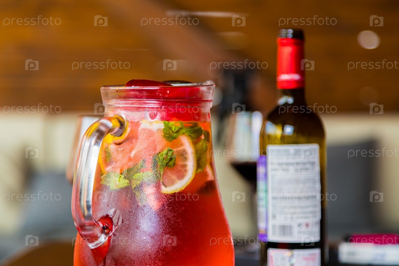 Обед с графином охлажденного красного морса с дольками лимона. Бутылка вина и травы