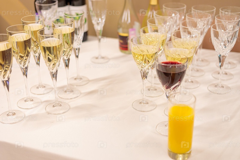 Бокалы с шампанским и белым вином на столе. Корпоративное, праздничное мероприятие. Алкогольные напитки