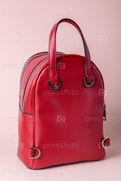 Модный женский рюкзак на розовом фоне. Кожаный красный рюкзак с железной молнией. Вид сзади