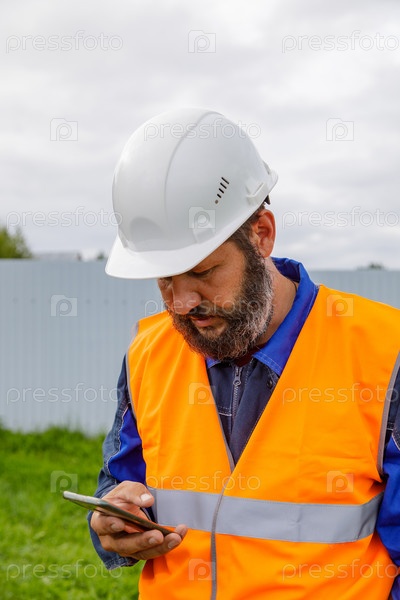 Инженер-строитель смотрит на мобильный телефон. Бородатый мужчина ищет информацию на своем мобильном телефоне