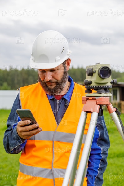 Инженер-строитель с оптическим уровнем смотрит в мобильный телефон