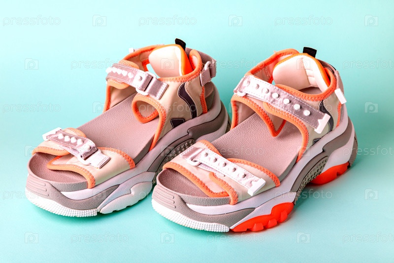 Женские, модные, спортивные сандалии с оранжевыми вставками на голубом фоне