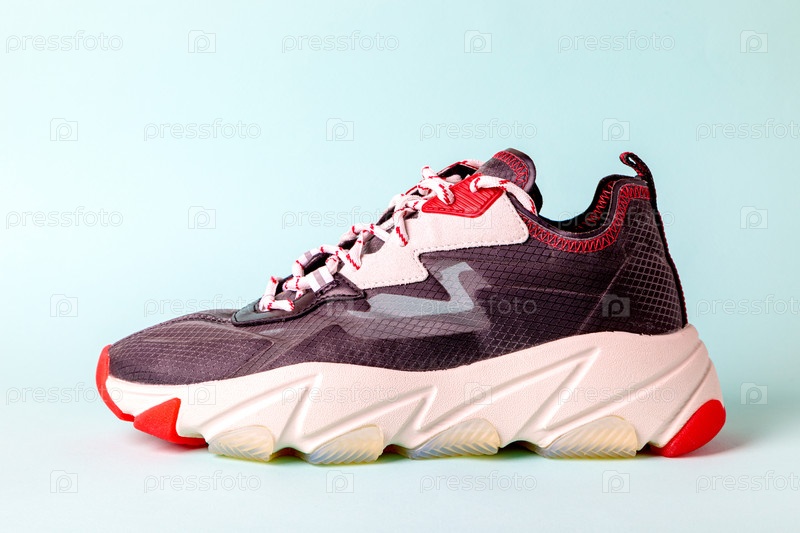 Женские, модные, спортивные кроссовки, черные с красными вставками на синем фоне. Новые молодежные туфли для девочек. Вид сбоку
