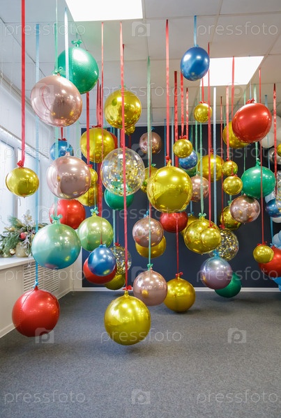 Елочные шары подвешены на ленточках. Празднование нового года, рождества