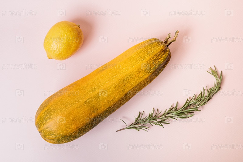 Желтые спелые кабачки с лимоном на розовом фоне. Осенняя концепция
