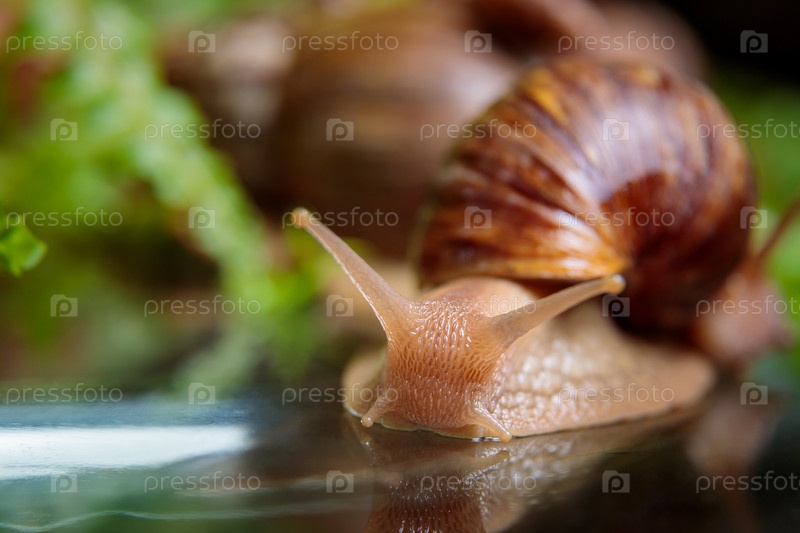 Большая улитка ползает по стеклянному столу, шевеля усиками