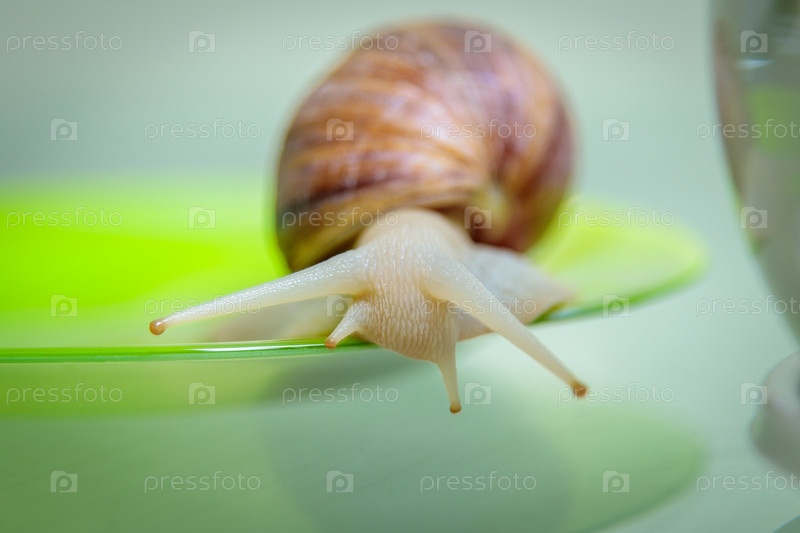 По краю тарелки скользит большая белая улитка. Медленно ползают крупные белые моллюски. Крупный план