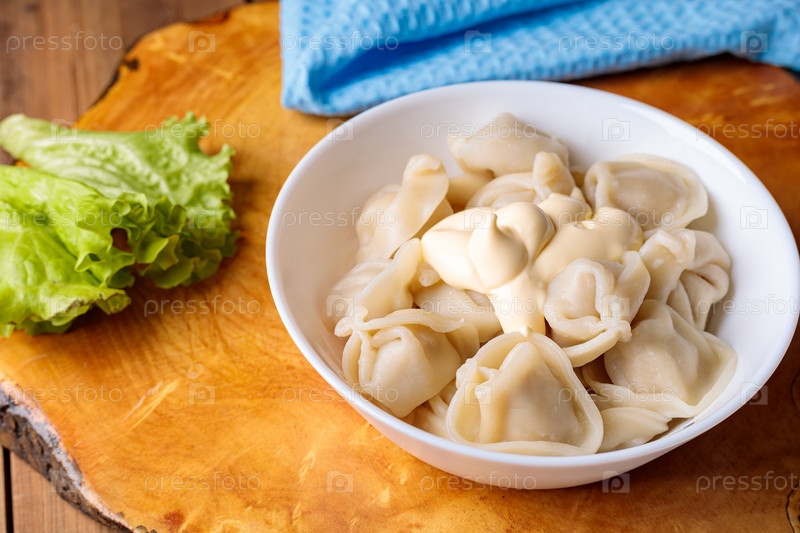 Пельмени в белой тарелке с салатом на деревянном фоне. Русская национальная еда