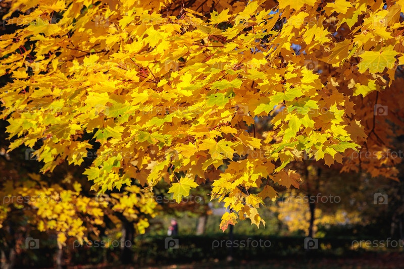 Клены с желтыми листьями в осеннем парке. Сезон осень