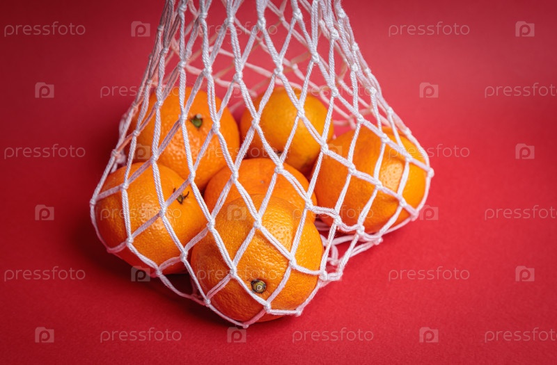 Экологичная сетка с мандаринами на красном праздничном фоне