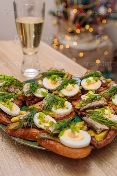 Поджаренный хлеб со шпротами, яйцами и зеленью. Традиционная русская еда к новогоднему столу